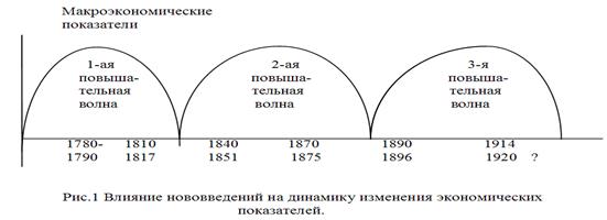 Определение роли научно-технических нововведений в циклическом, т.е. волнообразном характере изменения макроэкономических показателей в сфере рыночной предпринимательской деятельности было сформулировано известным российским ученым Н.Д. Кондратьевым, разработавшим в 20-х годах нашего столетия первую систематическую концепцию долговременных колебаний в экономике, получивших название длинных волн Кондратьева.[7, с.36]