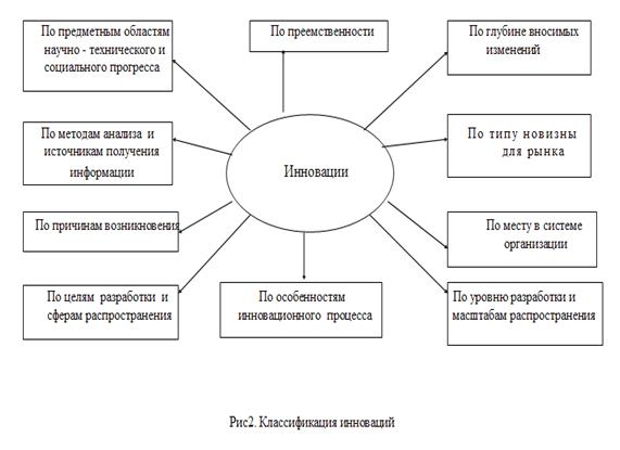 В работе Фатхутдинова Р.А. отмечается, что инновации могут относиться как к технике и технологии, так и к формам организации производства и управления и включают следующие виды: технико-технологические, организационные, управленческие, экономические, социальные, юридические и экологические.
