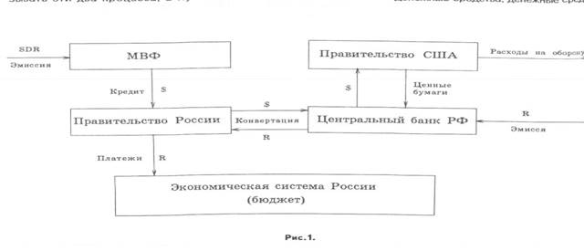 На рис. 1 показана схема движения денежных средств при разработанном МВФ способе эмиссии денег.