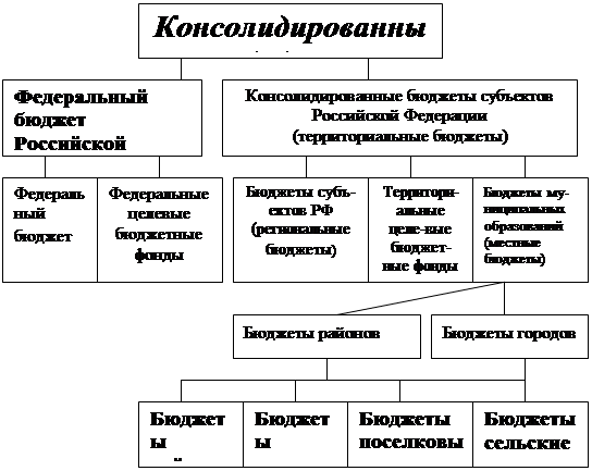 Под бюджетным устройством принято понимать организацию бюджетной системы и принципы ее построения.[3] Бюджетное устройство — это организация бюджетной системы, принципы ее построения.[4] В ст. 3 Закона «Об основах бюджетного устройства и бюджетного процесса в РФ» отмечается, что бюджетная система строится на принципах единства, полноты, гласности, реальности и самостоятельности всех видов бюджетов, входящих в бюджетную систему.[5] Бюджетное законодательство РФ содержит понятие «консолидированный бюджет» - свод бюджетов всех уровней бюджетной системы на соответствующей территории (ст. 6 БК РФ). Консолидированный бюджет субъекта РФ составляют бюджет самого субъекта и свод бюджетов находящихся на его территории муниципальных образований. Консолидированный бюджет РФ - это федеральный бюджет и консолидированные бюджеты субъектов РФ. Консолидированные бюджеты позволяют получить полное представление о всех доходах и расходах региона или Федерации в целом, они служат для аналитических и статистических целей.
