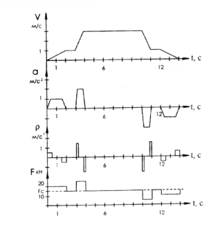 На рис. 1.2 представлены диаграммы скорости (семипериодная диаграмма), ускорения, рывка и тяговых усилий уравновешенной подъемной установки, которые достаточно полно характеризуют режим работы подъемного механизма и являются исходными данными для последующих расчетов (расчет мощности привода и др.).