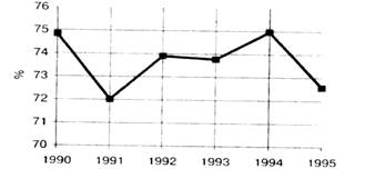 Рис. 2.1. Динамика потребления электроэнергии в Украине за 1990-1995 гг. от общей выработки в %