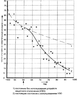Рис. 2.9. Изменение количества несчастных случаев со смертельным исходом от поражения человека током в Австрии до и после введения закона об использовании УЗО (диаграмма динамики) [10, с. 40, рис. 5]