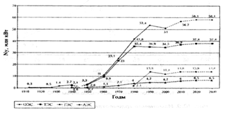Рис. 2.11. Установленная мощность электростанций ОЭС Украины, млн. кВт (диаграмма динамики) [16, с. 43, диагр. 1]