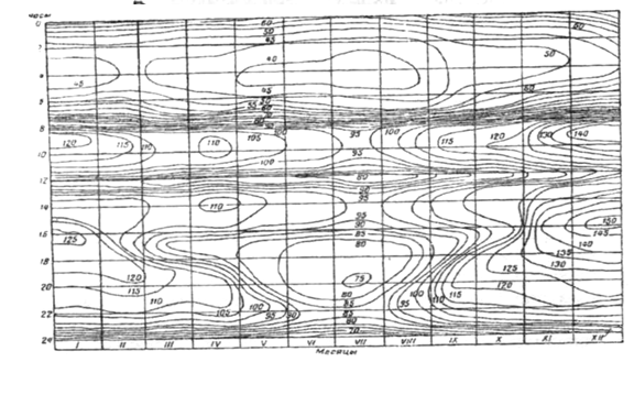 Рис. 2.21. Нагрузка электростанции по дням и часам года (универсальный график, цифры условные)