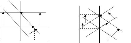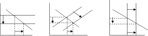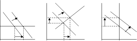 Изменение совокупного предложения имеет одинаковые последствия, независимо от вида кривой AS. Как видно из рис.3-7, рост совокупного предложения во всех трех случаях (если кривая совокупного предложения горизонтальна, имеет положительный наклон и вертикальна) ведет к росту равновесного уровня выпуска (от Y1 до Y2) и снижению равновесного уровня цен (от Р1 до Р2).