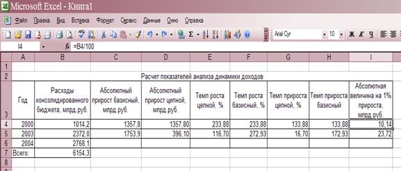 На фоне стабильного роста базисных показателей происходит уменьшение цепных показателей. Максимальный цепной коэффициент роста был в 2003 г. (2,34), он достиг своего минимального значения в 2004 г. и составил 1,17..Интересно отметить, что, в случае с динамикой расходов бюджета, минимальное абсолютное значение 1% прироста (10,14) приходится на год с минимальным темпом прироста (133,88) – 2003г., Это означает, что при увеличении темпов роста доходов консолидированного бюджета, на каждый процент прироста приходилось меньше дополнительных денег.