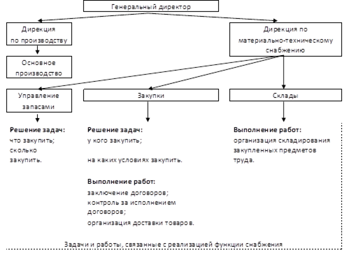В связи с этим возможно имеет место реформирование службы снабжения. Эффективным является такой вариант, когда все функции снабжения сосредоточены в одних руках, например в дирекции по материально-техническому снабжению. Такая структура создает широкие возможности логистической оптимизации материального потока на стадии закупок предметов труда. На рисунке 3 представлен вариант организационной структуры предприятия с сосредоточением всех задач снабжения в одном подразделении.