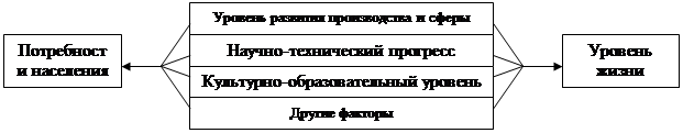 Уровень жизни населения определяется, с одной стороны, составом и величиной потребностей в различных жизненных благах (продукты питания, одежда, жилище, транспорт, различные коммунальные и бытовые услуги, образование, медицинское обслуживание, культурно-просветительные мероприятия и т.д.), с другой – возможностью их удовлетворения, исходя из предложений на рынке товаров и услуг и реальных доходов людей, их заработной платы. В свою очередь и размер реальной заработной платы, и уровень жизни населения определяются степенью эффективности производства на основе использования достижений научно-технического прогресса, масштабом развития и качеством сферы услуг, образовательным и культурным уровнем населения.
