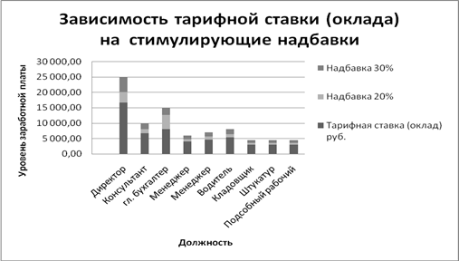 Это происходит из-за того, что на предприятии нет едино установленных сумм надбавок. Заработная плата сотрудника зависит от тарифной ставки и двух надбавок 20% и 30%. Зависимость тарифной ставки на стимулирующие надбавки представлены в диаграмме 2.