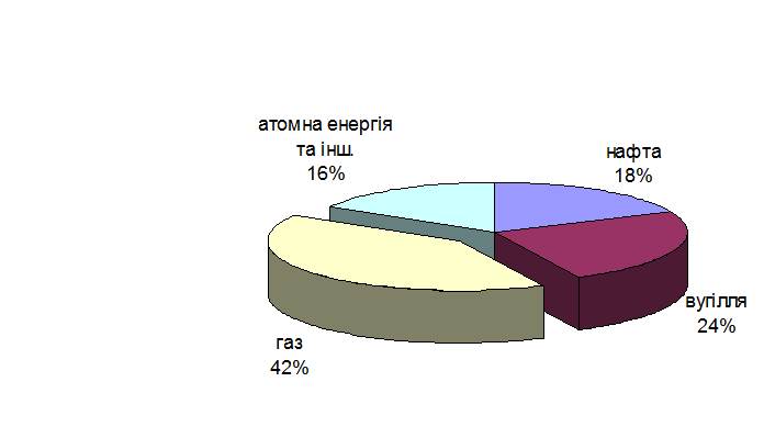 Структура паливно-енергетичного балансу світу: нафта – 40%, природний газ – 23%, вугілля – 31%, інші види палива – 1%, атомна енергія – 2%, гідроенергія – 3%.