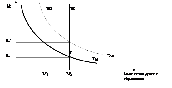 Если растет спрос на деньги, то экономические субъекты предъявляют спрос на деньги больший, чем банковская система в состоянии предложить. Субъекты пытаются приобрести больше денег, продавая ценные бумаги и прося ссуды. Это ведет к повышению равновесной R.