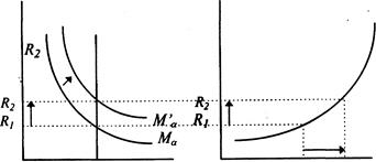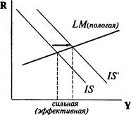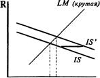 2) Если спрос на деньги высокочувствителен к повышению процентных ставок и достаточно незначительного увеличения R, чтобы уравновесить денежный рынок. Поскольку повышение R незначительно, то и эффект вытеснения будет относительно мал (даже при относительно высоких коэффициентах чувствительности I и Хп к динамике R). Графически эта ситуация иллюстрируется более пологой кривой LM (см.рис.4.4). Наклон кривой IS имеет в данном случае второстепенное значение.