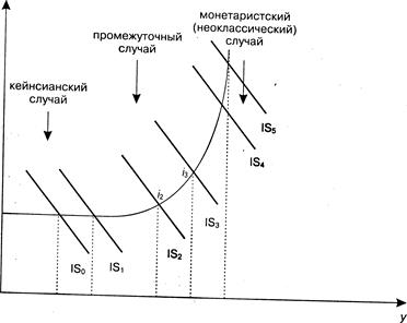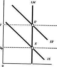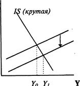 Стимулирующая фискальная политика оказывается наименее эффективной в случае сочетания относительно пологой IS и крутой LM. В этом случае прирост Y, равный (Y0Y1), очень мал, так как и повышение ставок процента очень велико, и коэффициенты d и п значительны.
