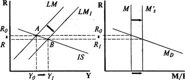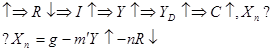 Увеличение денежной массы Ms сопровождается снижением процентных ставок R (см. рис.9.6), так как ресурсы для кредитования расширяются и цена кредита снижается. Это способствует росту инвестиций I. В итоге совокупные расходы и доход Y увеличиваются, вызывая рост потребления С. Динамика чистого экспорта Хп оказывается под влиянием двух противодействующих факторов: роста совокупного дохода Y, который сопровождается снижением чистого экспорта, и снижения ставки процента, которое сопровождается его ростом. Конкретное изменение величины Хп зависит от величин изменений У и R, а также от значений предельной склонности к импортированию т' и коэффициента п.