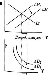 Увеличение предложения денег сдвигает кривую LM вправо до положения LM ’ что отражает рост совокупного спроса AD до AD '. Сдвиг AD сопровождается инфляцией спроса - цены увеличиваются с Ро до Р1. Это относительно сокращает реальное денежное предложение и кривая LM ' смещается назад влево до положения LM". В точке А устанавливается краткосрочное макроэкономическое равновесие.