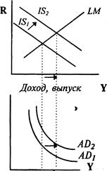 Увеличение государственных расходов, сокращение налогов или увеличение предложения денег сдвигают кривую совокупного спроса вправо. Однотипный сдвиг кривой AD сопровождает совершенно различные сдвиги кривых IS и LM, соответствующие мерам стимулирующей бюджетно-налоговой и кредитно-денежной политики (см.рис.9.20 и рис.9.21).