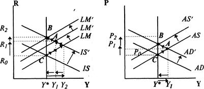 В условиях инфляции спроса экономические агенты постепенно корректируют свое поведение: повышаются ставки номинальной заработной платы. Это увеличивает средние издержки на единицу продукции и сокращает прибыль фирм. Постепенно фирмы начинают снижать свой выпуск и кривая AS медленно смещается влево. Сокращение AS вызывает дальнейший рост цен (инфляция издержек) от Р1 до Р2 повышение цен смещает кривую LM ' еще дальше влево, в положение LM ". Так как предложение денег все время относительно снижается, то ставка процента все время возрастает (от ro до R 2). В точке В устанавливается долгосрочное макроэкономическое равновесие при более высоком уровне цен и процентных ставок, чем в точке С, и изменении структуры экономики в пользу государственного сектора. Уровень производства равен потенциальному.