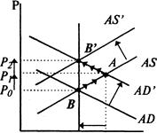 В дальнейшем инфляция издержек приводит к спаду совокупного предложения: кривая AS смещается влево до AS ’. Повышение цен от р1 до Р2 возвращает кривую LM" в исходное положение LM, так как реальное предложение денег постоянно снижается. В точке В’ устанавливается долгосрочное макроэкономическое равновесие при потенциальном уровне производства, исходном уровне процентных ставок rq и возросшем с Ро до Р2 Уровне цен. Очевидно, что в долгосрочном плане рост денежной массы вызывает только рост цен при неизменности бальных переменных. Это явление получило название нейт ральности денег.