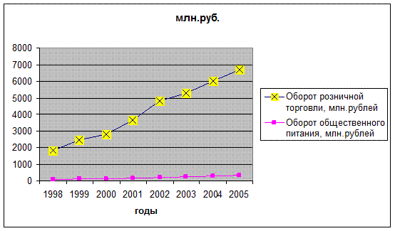 Графическое представление изменения оборота розничной торговли и общественного питания с 1998 года по 2005 год