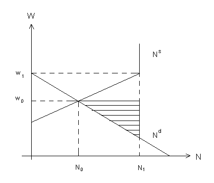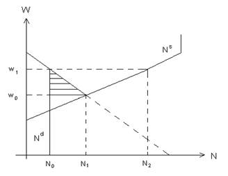 С позиции классической школы в данном случае цена труда завышена на величину (W0 –W1). Но даже при снижении ее до W1 сохранится безработица в размере (N1 –N0 ), которая не устраняется в ходе стихийного взаимодействия спроса и предложения на рынке труда. В данном случае рынок труда стабилизируется при неэффективном уровне занятости, так как предельная производительность труда превышает предельные издержки на него. Площадь заштрихованного треугольника рис. 1.2 представляет чистый выигрыш от увеличения производства путем доведения занятости до N1 [6] .