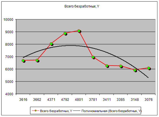 По полученным данным можно сделать вывод, что минимальный уровень безработицы был зарегистрирован в 1992 г. на уровне 3877 тыс.чел., а максимальный уровень в 1999 г. на уровне 9094 тыс.чел. Такое положение вещей объясняется тем, что в 1992 – год перехода от одной системы к другой, а 1999 – год , после экономического кризиса.