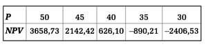 Выберем параметр, влияние которого будет исследоваться. Предположим, что таким параметром является цена. Диапазон ее изменений составляет 35-55. Вычислим критерий NPV по формуле (14), варьируя значения цены (например, от 50 до 30 с шагом, равным 5), при этом остальные параметры неизменны.