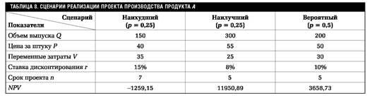 Прежде всего необходимо определить значение NPV для каждого сценария, например, с помощью соотношения (14). С целью сокращения необходимых вычислений эти значения представлены в табл.8.