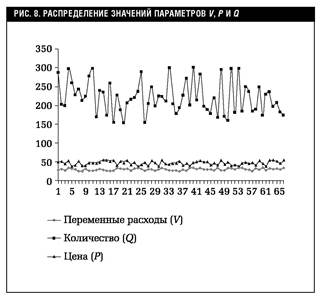 На рис.8 приведен график распределения значений ключевых параметров V , P и Q , построенный на основании 75 имитаций.