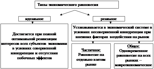 Идеальным (теоретически желаемым) равновесием будет стабильное использование экономического потенциала ресурсов общества при оптимальной реализации интересов всех участников хозяйственной деятельности. Выявление нарушений и отклонений фактического равновесия от их идеальной модели дает возможность нахождения путей и способов их устранения. Кроме идеального и фактического (реального) равновесия выделяют, как уже отмечалось, частичное, т.е. равновесие на отдельных рынках, и общее, представляющее собой единую взаимосвязанную систему частичных равновесий.