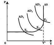 Приспособление экономики в случае отклонения от различных равновесных состояний в точках E1 ,Е2 и Е3 будет происходить по-разному. В кейнсианском случае, когда цены и заработная плата жестки, возвращение в точку равновесия E1 будет происходить за счет колебаний в объемах реального ВВП. Фирмы будут сокращать или расширять производство при неизменном уровне цен в стране. В промежуточном случае отклонение от точки Е2 будет сопровождаться приспособлением экономики к равновесному состоянию путем изменения и уровня цен, и объемов выпуска. В классическом случае при отклонении от точки Е3 возвращение к равновесному состоянию будет происходить только за счет изменения гибких цен и за работной платы без каких-либо изменений в объеме реального выпуска, поскольку экономика уже находится на уровне потенциального ВВП.