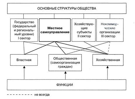 Политологи разделяют общество на три основных сектора, каждому из которых отведены своя роль и свои функции. Первый сектор — власть (функция власти, политическая функция); второй сектор — бизнес (хозяйственная функция); третий сектор — гражданское общество (общественная функция, самоорганизация граждан для решения значимых социальных и иных задач, требующих совместных усилий). Если под этим углом зрения взглянуть на местное самоуправление, то можно сделать вывод, что в современном обществе оно выполняет все три перечисленные функции [14].