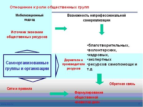 - источником социальных инноваций, ведь уже и сейчас многие образовательные, управленческие и информационные технологии, современные методы социальной работы были впервые внедрены именно некоммерческими организациями, а затем стали частью государственной и муниципальной политики (конкурсы социальных и образовательных проектов, кризисные центры для пострадавших от насилия и т.п.);