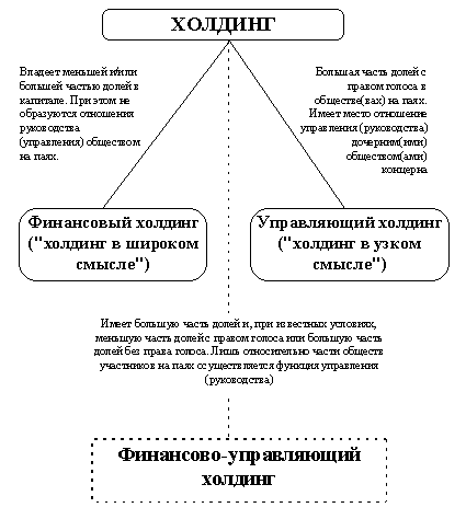 Холдинговая компания - это система коммерческих организаций, которая включает в себя «управляющую компанию», владеющую контрольными пакетами акций и/или паями дочерних компаний, и дочерние компании. Управляющая компания может выполнять не только управленческие, но и производственные функции. Дочерним же признаётся хозяйственное общество, действия которого определяются другим (основным) хозяйственным обществом или товариществом либо в силу преобладающего участия в уставном капитале, либо в соответствии с заключённым между ними договором, либо иным образом (п. 1 ст.105 ГК; п. 2 ст. 6 Закона об акционерных обществах; п.2 ст. 6 Закона об обществах с ограниченной ответственностью).
