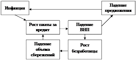 Если в экономике не хватает денег, т.е. очень низкий индекс демонетизации, то это неизбежно приведет к спаду производства, к кризису и росту общего уровня цен – инфляции. Любая антиинфляционная политика, проводимая правительством, борется с инфляцией и предотвращает рост цен, но, с другой стороны, с неизбежностью ведет к экономическому кризису. Платой за снижение темпов инфляции является падение объемов производства.