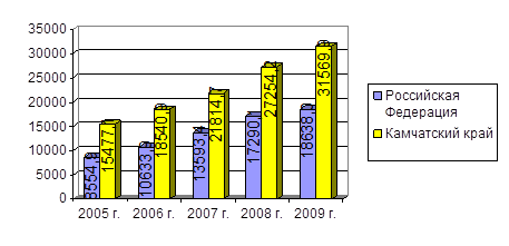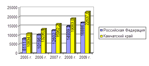 Изучив величины начисленных заработных плат населения Камчатского края с и сравнив их с общероссийскими показателями, можно прийти к выводу, что начисления заработной платы в Камчатском крае в среднем больше на 70 процентов, чем начисления заработной платы по всей стране. Максимальная разница была зафиксирована в 2005 году, она составила 81%, минимальная разница наблюдалась в 2008 году – 57,5%.