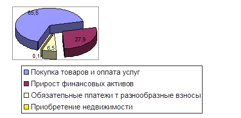 При анализе структуры и состава расходов населения края выявилась определенная закономерность, на первом месте стояли затраты населения на покупку товаров и оплату услуг, на втором месте прирост финансовых активов, на третьем месте расходы на обязательные платежи и разнообразные взносы, на четвертом месте расходы на приобретение недвижимости. Следует заметить, что за период с 2000 по 2009 год затраты населения на покупку товаров и оплату услуг уменьшились практически на 14 процентов, прирост финансовых активов увеличился почти на 8 процентов, так же увеличились затраты на обязательные платежи и разнообразные взносы на 5 процентов. Расходы на приобретение недвижимости увеличились всего на 0,8 процентов.