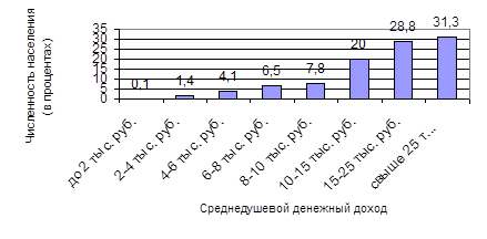 Распределение населения по среднедушевому денежному доходу имеет правостороннюю асимметрию и может быть одномодальным или бимодальным. В России бимодальное распределение появилось в области высоких денежных доходов, что свидетельствует о дифференциации среди высокодоходных групп населения. При образовании и стабилизации ''среднего класса'' бимодальность в распределении населения по доходу исчезает.
