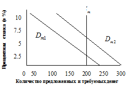 Сдвиг в спросе на деньги происходит вследствие растущего уровня цен. В этом случае рост количества денег, находящихся в обращении, в ответ на изменение в спросе на деньги лишь подольёт масла в пламя инфляции. Вероятно, необходимо сопротивляться инфляционным процессам, сохраняя в обращении постоянное количество денег и “опустив на свободу” номинальную норму процента. В этом случае наилучшей окажется вертикальная кривая спроса на деньги.