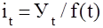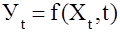 3) Аналитическое выравнивание. Под этим понимают определение основной проявляющейся во времени тенденции развития изучаемого явления. Развитие предстает перед исследователем как бы в зависимости только от течения времени. В итоге выравнивания временного ряда получают наиболее общий, суммарный, проявляющийся во времени результат действия всех причинных факторов. Отклонение конкретных уровней ряда от уровней, соответствующих общей тенденции, объясняют действием факторов, проявляющихся случайно или циклически. В результате приходят к трендовой модели, выраженной формулой 15: