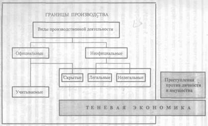 По характеру связи с производством следует различать ту часть теневой экономики, которая участвует в производстве товаров и услуг, и ту, через которую осуществляется лишь перераспределение созданного вне ее. Вторая отмеченная часть может быть весьма значительной, и поэтому без учета данного разграничения сложно выявить действительную роль теневой составляющей экономики[6] .