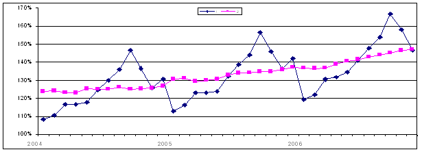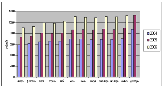 Наблюдается также увеличение среднемесячной начисленной заработной платы. По данным Росстата, в ноябре 2007 г. среднемесячная заработная плата составила 11267 руб. и возросла по сравнению с ноябрем 2006 г. на 25 процентов. Следует отметить, что темпы роста среднемесячной заработной платы в прошлом году наблюдались несколько выше, чем за соответствующий период 2006 года. Так за январь-ноябрь 2007 г. прирост среднемесячной заработной платы составил 24,3% против 23,4% за аналогичный период 2006 г. Реальная начисленная заработная плата за январь-ноябрь 2007 года составила 113,3%, в то время как за аналогичный период 2006 года она составила 109,3 процента. На рис. 1.2 представлена динамика номинальной заработной платы в 2005-2007гг.