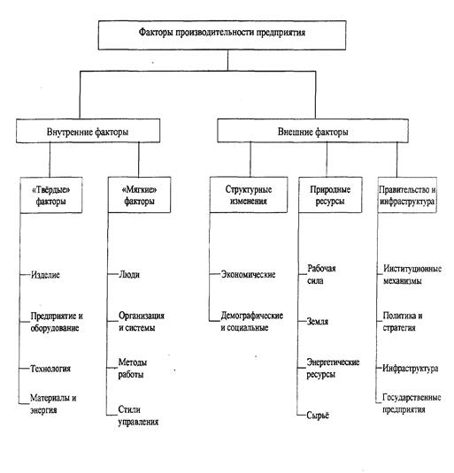 Внутренние факторы . Поскольку одни внутренние факторы легче изменяются, чем другие, целесообразно разделить их на две группы: твердые, устойчивые (изменяемые с трудом) и мягкие, неустойчивые (легко изменяющиеся). Твердые факторы включают в себя изделия, технологию, оборудование и сырье, а мягкие факторы включают в себя качество рабочей силы, организационные системы и методы, стили управления и методы работы. Такая классификация помогает выстраивать приоритеты - с какими факторами работать легче, а какие требуют более сильного финансового и организационного вмешательства.