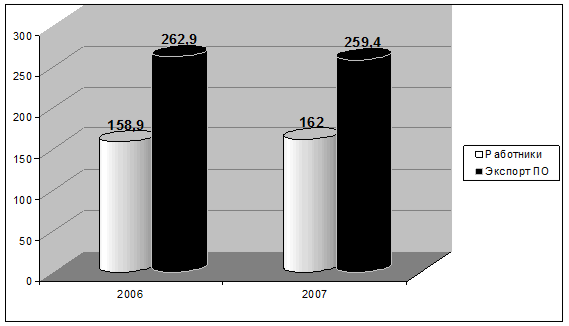 Динамика численности работников и объёмов экспорта программного обеспечения Парка высоких технологий Республики Беларусь за 2005-2007 гг.