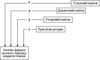 Захисна функція. У той час, як попередня функція характеризує значення власного капіталу та статутного капіталу для кредиторів, захисна функція показує, яке значення має власний капітал для власників. Чим більший власний капітал, тим краще захищеним є підприємство від впливу загрозливих для його існування факторів, оскільки саме за рахунок власного капіталу можуть покриватися збитки підприємства. Якщо в результаті збиткової діяльності відбувається перманентне зменшення власного та статутного капіталу, то підприємство може опинитися на межі банкрутства [24, 211].