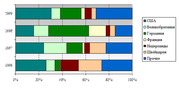 Также следует отметить изменение географической структуры привлечённых иностранных инвестиций - снижение уровня концентрации инвестиций при сохранении лидирующей роли фирм США и сокращении поступлений из Германии, активизировались притоки капитала из Азиатско-тихоокеанского региона. Иностранные инвесторы из других стран в большинстве случаев участвуют в создании совместных предприятий. При формировании небольшого уставного капитала иностранные инвесторы увеличивают долю своего участия за счет предоставления кредитных ресурсов и гарантированного сбыта продукции на мировом рынке, а также продвижения продукции на внутреннем рынке. В качестве приоритетного направления инвестирования европейские компании ориентируются на выбор предприятий обрабатывающей промышленности.