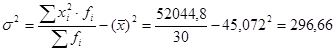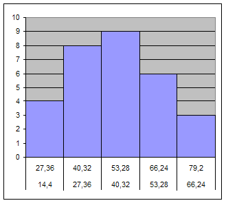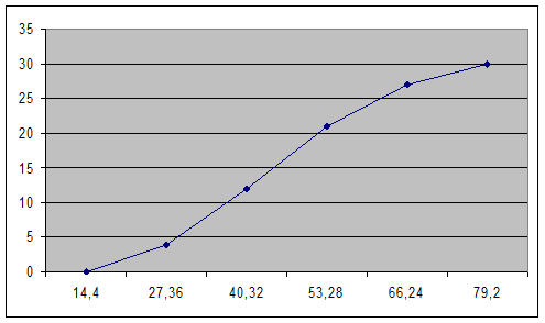 Наименьшее число предприятий составляют группу с выпуском продукции от 66,24 до 79,2 – 3 предприятия. Значение среднего квадратического отклонения (17,22 млн. руб.) показывает, что большинство предприятий совокупности с выпуском продукции от 27,852 до 62,292 млн. руб.