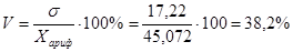 Значение коэффициента вариации (38,2%) свидетельствует о неоднородности рассматриваемой совокупности (т.к. V>33%), и нетипичности средней.