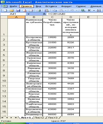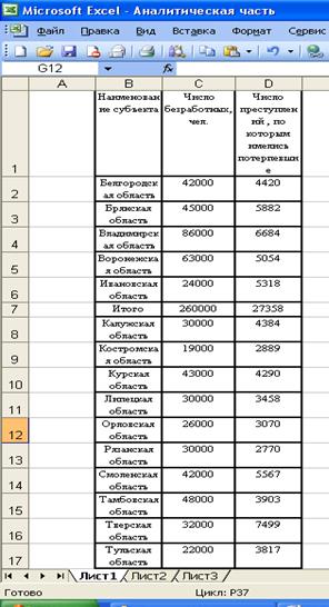 В аналитической части проведен анализ зависимости числа преступлений от количества безработных в центральном регионе России за 2007 год с применением пакета прикладных программ обработки электронных таблиц MS Excel в среде Windows.