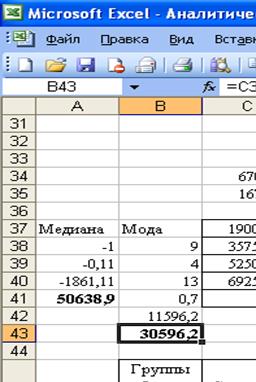 7) В ячейке В43 определяем моду, а в ячейке А41 – медиану ряда.